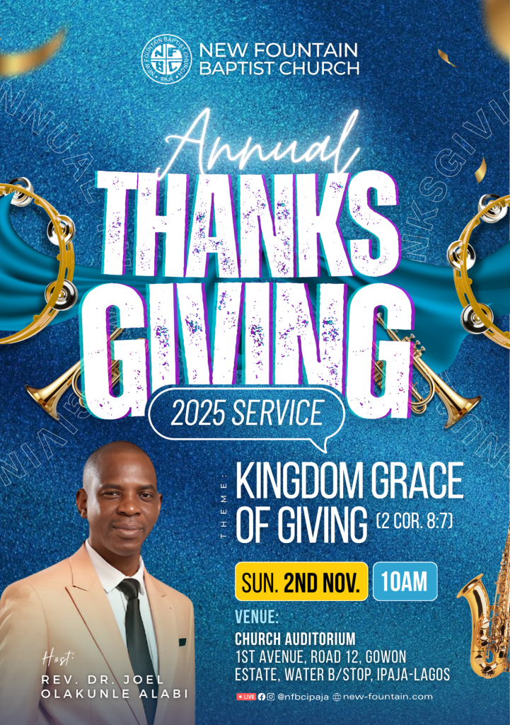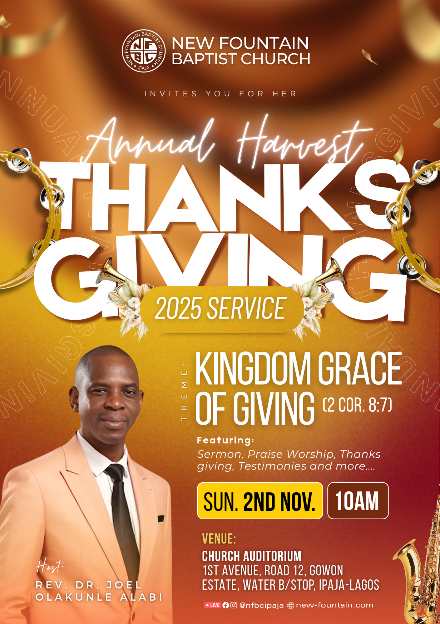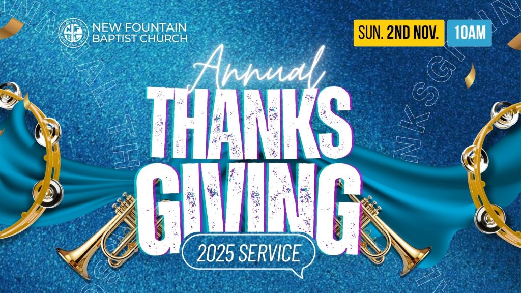 Join us for a spirit-filled Annual Thanksgiving Service 2025 at New Fountain Baptist Church — a joyful gathering to celebrate God’s faithfulness and the overflowing grace of giving in His Kingdom.